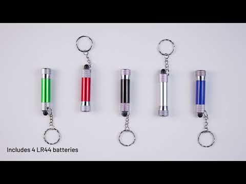 Hliníkový přívěsek na klíče (92 % rAL) s 3-světelnou LED svítilnou. Součástí jsou 3 baterie LR44. Celkem: 115 x 25 x 15 mm