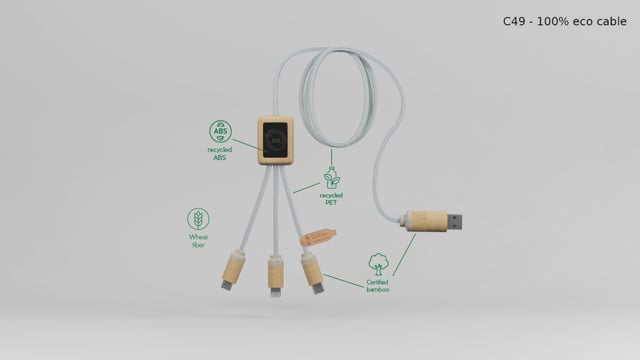 2,4A rychlonabíjecí kabel (3 × 10 cm), který lze přizpůsobit pomocí svítícího loga na obou stranách, které může být každé jiné. Tento kabel je celý vyroben z udržitelnějších materiálů: recyklované PET šňůry, bambus, pšeničná vlákna a recyklovaný plast. Nabíjecí kabel je díky svým 3 výstupům (typ C, Android, iPhone) univerzální a dokáže nabíjet až tři zařízení současně. Díky dvojitému USB a USB-C vstupu je tento kabel kompatibilní s nejnovějšími nabíječkami. Dodáváno v bavlněném sáčku (20 × 8 cm) s kartou z kraftového papíru.
